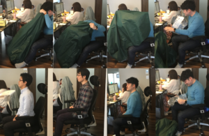 椅子の上に置いて座ることで、自然と姿勢がよくなるというものを選びました。田中と細谷も座ってみていました。